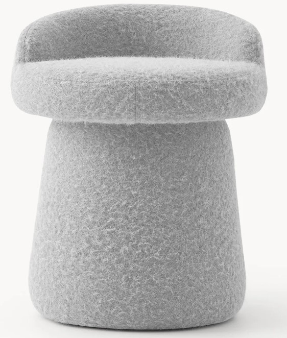 Obrotowe krzesło w nieoczywistej formie – bez tradycyjnego oparcia, z tapicerowaną nogą i w tkaninie o wyjątkowej, moherowej fakturze. Lekko ekscentryczne, zdecydowanie stylowe. Posłuży jako krzesło przy stole, pomocnik w holu, sypialni bądź garderobie. Dostępny w wyjątkowych kolorach Ice, Rouge, Honey i Grey urozmaici wnętrze pod każdym kątem. Zgrabny format sprawia, że pasuje do różnych przestrzeni, a mimo to zaskakuje wygodą.